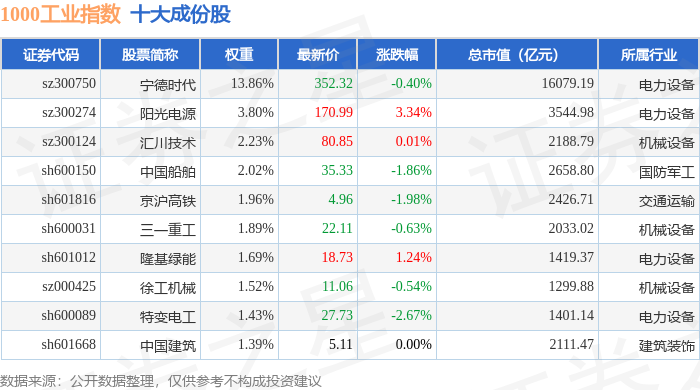 证券之星消息,1月16日,1000工业(399383)指数报收于3110.94点,涨0.11%,成交3271.68亿元,换手率2.0%。当日该指数成份股中,上涨的有110家,德邦股份以10.01%的涨幅领涨,下跌的有104家,金风科技以9.99%的跌幅领跌。