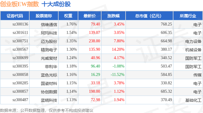 创业板EW(399635)指数十大成份股详情如下: