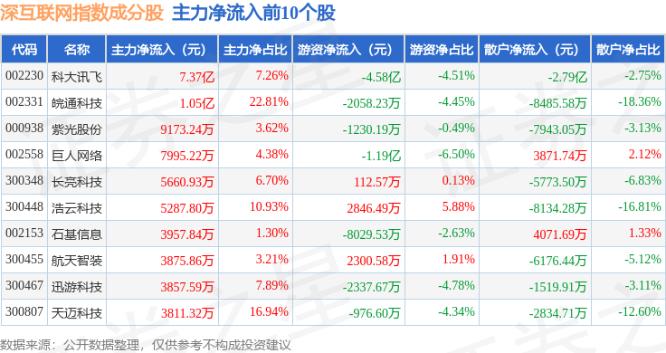资金流向方面,深互联网(399675)指数成份股当日主力资金净流出合计147.04亿元,游资资金净流入合计22.87亿元,散户资金净流入合计124.16亿元。成份股资金流向详情见下表: