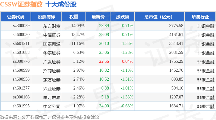 CSSW证券(399707)指数十大成份股详情如下: