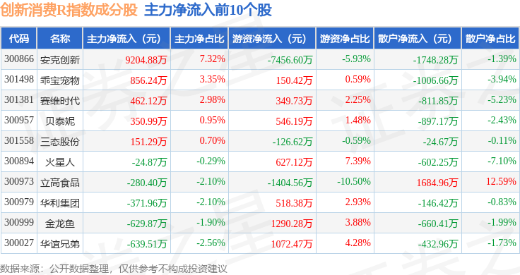 资金流向方面,创新消费R(470041)指数成份股当日主力资金净流出合计75.54亿元,游资资金净流入合计8.46亿元,散户资金净流入合计67.08亿元。成份股资金流向详情见下表: