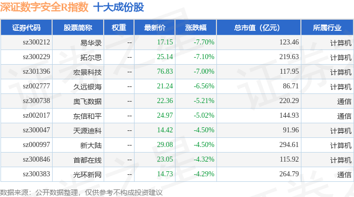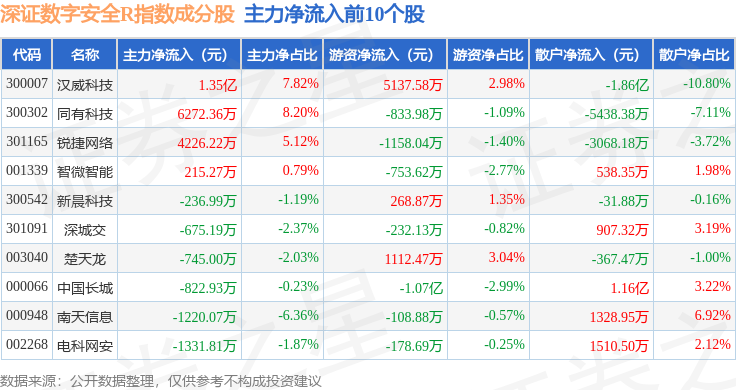 资金流向方面,深证数字安全R(470052)指数成份股当日主力资金净流出合计49.61亿元,游资资金净流入合计6.66亿元,散户资金净流入合计42.95亿元。成份股资金流向详情见下表: