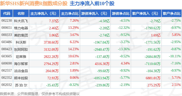 资金流向方面,新华SHS新兴消费R(489006)指数成份股当日主力资金净流出合计6.94亿元,游资资金净流出合计8.85亿元,散户资金净流入合计15.79亿元。成份股资金流向详情见下表: