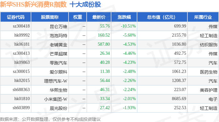 新华SHS新兴消费R(489006)指数十大成份股详情如下: