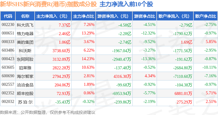 资金流向方面,新华SHS新兴消费R(港币)(489007)指数成份股当日主力资金净流出合计6.94亿元,游资资金净流出合计8.85亿元,散户资金净流入合计15.79亿元。成份股资金流向详情见下表: