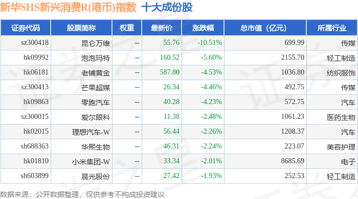 新华SHS新兴消费R(港币)(489007)指数十大成份股详情如下: