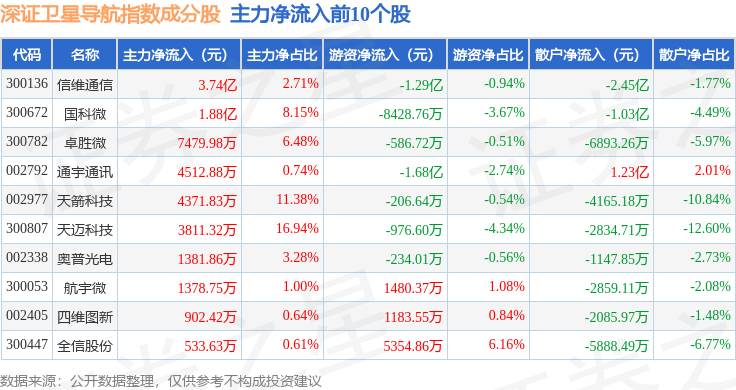 资金流向方面,深证卫星导航(970050)指数成份股当日主力资金净流出合计28.07亿元,游资资金净流入合计5.77亿元,散户资金净流入合计22.29亿元。成份股资金流向详情见下表: