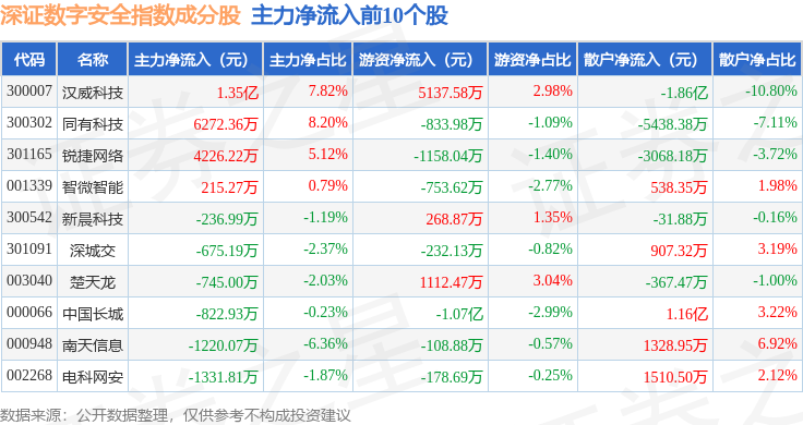 资金流向方面,深证数字安全(970052)指数成份股当日主力资金净流出合计49.61亿元,游资资金净流入合计6.66亿元,散户资金净流入合计42.95亿元。成份股资金流向详情见下表: