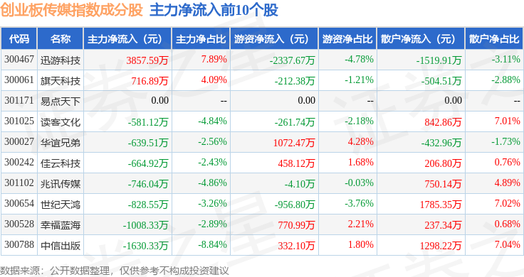 资金流向方面,创业板传媒(970084)指数成份股当日主力资金净流出合计64.42亿元,游资资金净流入合计5.67亿元,散户资金净流入合计58.76亿元。成份股资金流向详情见下表: