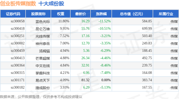 创业板传媒(970084)指数十大成份股详情如下: