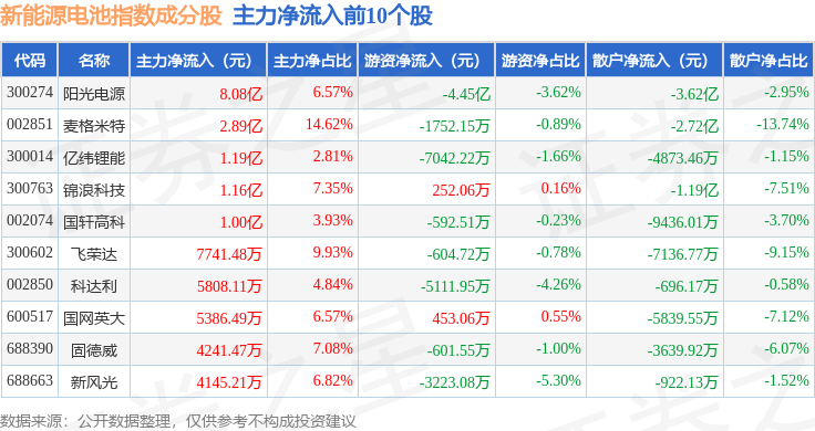 资金流向方面,新能源电池(980027)指数成份股当日主力资金净流出合计6.05亿元,游资资金净流入合计3.98亿元,散户资金净流入合计2.07亿元。成份股资金流向详情见下表: