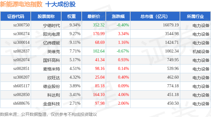 新能源电池(980027)指数十大成份股详情如下: