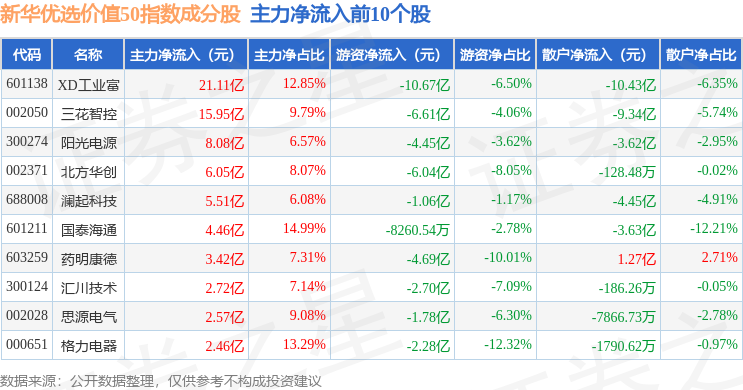 资金流向方面,新华优选价值50(989004)指数成份股当日主力资金净流入合计3.81亿元,游资资金净流出合计30.43亿元,散户资金净流入合计26.62亿元。成份股资金流向详情见下表:
