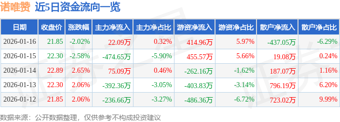 1月16日的资金流向数据方面,主力资金净流入22.09万元,占总成交额0.32%,游资资金净流入414.96万元,占总成交额5.97%,散户资金净流出437.05万元,占总成交额6.29%。