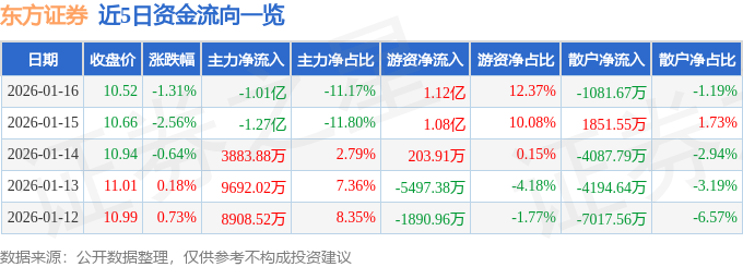 证券之星消息,截至2026年1月16日收盘,东方证券(600958)报收于10.52元,下跌1.31%,换手率1.14%,成交量85.47万手,成交额9.05亿元。