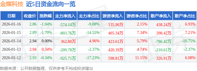 证券之星消息,截至2026年1月16日收盘,金煤科技(600844)报收于2.86元,下跌1.04%,换手率2.69%,成交量22.09万手,成交额6321.41万元。