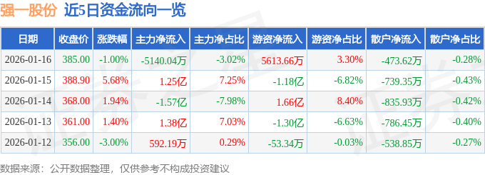 证券之星消息,截至2026年1月16日收盘,强一股份(688809)报收于385.0元,下跌1.0%,换手率17.82%,成交量4.34万手,成交额17.0亿元。