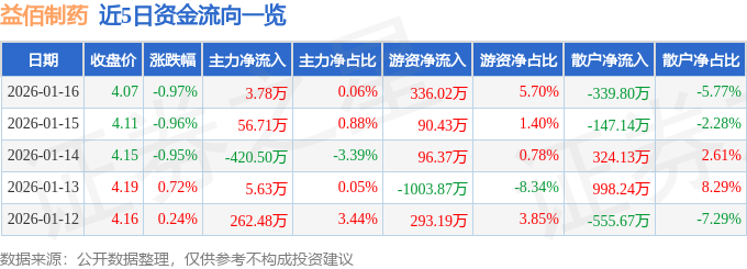 证券之星消息,截至2026年1月16日收盘,益佰制药(600594)报收于4.07元,下跌0.97%,换手率1.83%,成交量14.47万手,成交额5891.59万元。