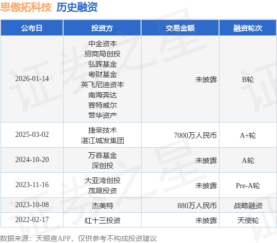 证券之星消息,根据天眼查APP于1月14日公布的信息整理,深圳市思傲拓科技有限公司B轮融资,融资额未披露,参与投资的机构包括中金资本,招商局创投,弘晖基金,粤财基金,英飞尼迪资本,南海奔达,赛特威尔,誉华资产。
