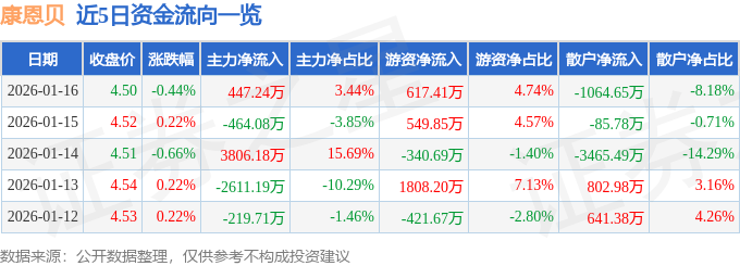 1月16日的资金流向数据方面,主力资金净流入447.24万元,占总成交额3.44%,游资资金净流入617.41万元,占总成交额4.74%,散户资金净流出1064.65万元,占总成交额8.18%。