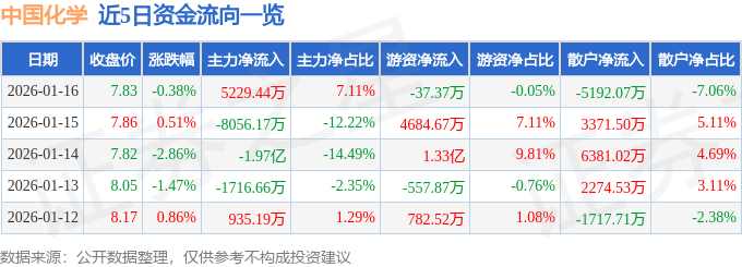 证券之星消息,截至2026年1月16日收盘,中国化学(601117)报收于7.83元,下跌0.38%,换手率1.53%,成交量92.91万手,成交额7.35亿元。