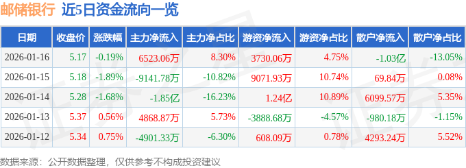 证券之星消息,截至2026年1月16日收盘,邮储银行(601658)报收于5.17元,下跌0.19%,换手率0.23%,成交量152.15万手,成交额7.86亿元。