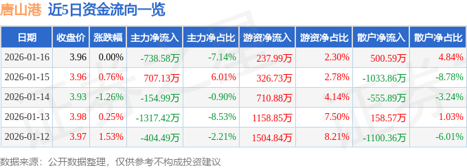 证券之星消息,截至2026年1月16日收盘,唐山港(601000)报收于3.96元,上涨0.0%,换手率0.44%,成交量26.15万手,成交额1.03亿元。
