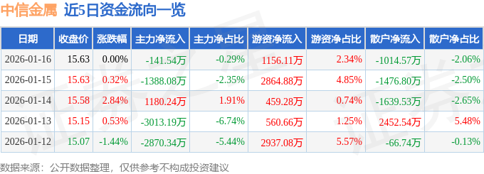 证券之星消息,截至2026年1月16日收盘,中信金属(601061)报收于15.63元,上涨0.0%,换手率6.23%,成交量31.2万手,成交额4.94亿元。