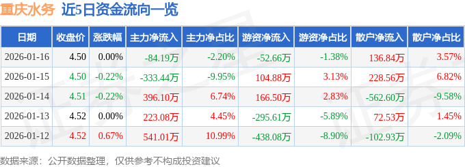 证券之星消息,截至2026年1月16日收盘,重庆水务(601158)报收于4.5元,上涨0.0%,换手率0.18%,成交量8.5万手,成交额3827.89万元。