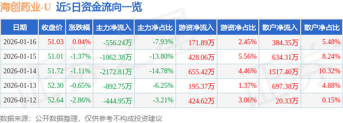 证券之星消息,截至2026年1月16日收盘,海创药业(688302)报收于51.03元,上涨0.04%,换手率1.39%,成交量1.38万手,成交额7012.99万元。
