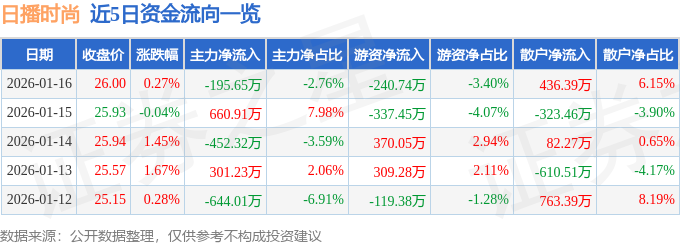 证券之星消息,截至2026年1月16日收盘,日播时尚(603196)报收于26.0元,上涨0.27%,换手率1.16%,成交量2.74万手,成交额7090.9万元。