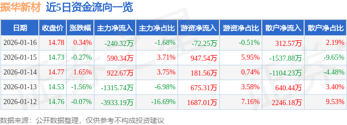 证券之星消息,截至2026年1月16日收盘,振华新材(688707)报收于14.78元,上涨0.34%,换手率1.91%,成交量9.69万手,成交额1.43亿元。