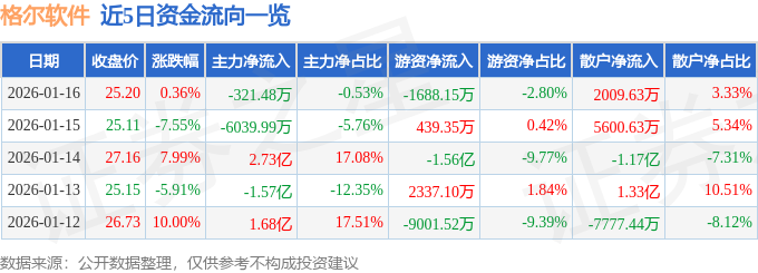 证券之星消息,截至2026年1月16日收盘,格尔软件(603232)报收于25.2元,上涨0.36%,换手率10.3%,成交量23.82万手,成交额6.04亿元。