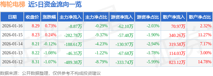 证券之星消息,截至2026年1月16日收盘,梅轮电梯(603321)报收于8.29元,上涨0.73%,换手率1.22%,成交量3.7万手,成交额3064.25万元。