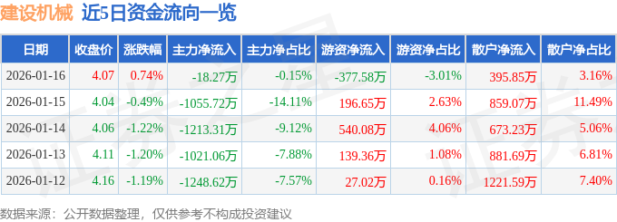 证券之星消息,截至2026年1月16日收盘,建设机械(600984)报收于4.07元,上涨0.74%,换手率2.42%,成交量30.47万手,成交额1.25亿元。