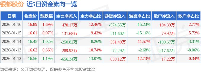 1月16日的资金流向数据方面,主力资金净流入470.17万元,占总成交额12.46%,游资资金净流出574.55万元,占总成交额15.23%,散户资金净流入104.39万元,占总成交额2.77%。