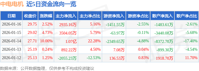 证券之星消息,截至2026年1月16日收盘,中电电机(603988)报收于29.75元,上涨2.52%,换手率8.26%,成交量19.42万手,成交额5.69亿元。
