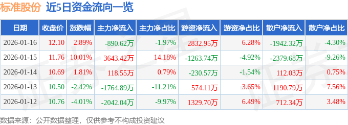 证券之星消息,截至2026年1月16日收盘,标准股份(600302)报收于12.1元,上涨2.89%,换手率10.61%,成交量36.72万手,成交额4.51亿元。