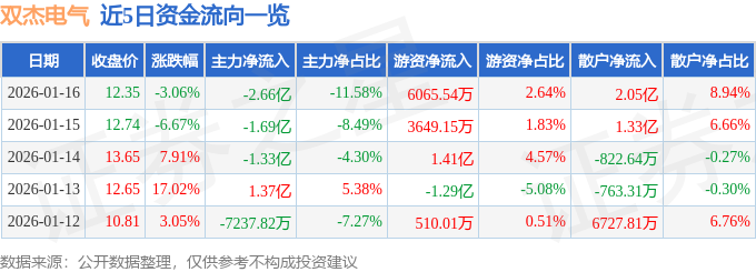 证券之星消息,截至2026年1月16日收盘,双杰电气(300444)报收于12.35元,下跌3.06%,换手率27.37%,成交量170.11万手,成交额22.95亿元。