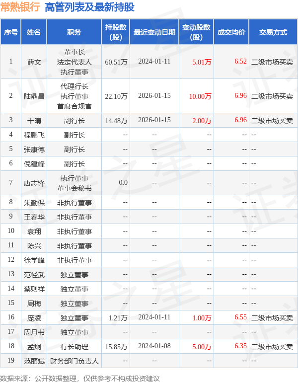 常熟银行近半年内的董监高及核心技术人员增减持详情如下: