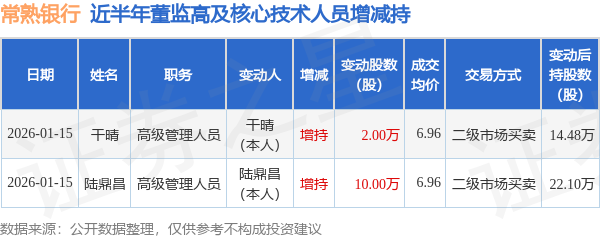 证券之星消息,根据1月16日市场公开信息、上市公司公告及交易所披露数据整理,常熟银行(601128)最新董监高及相关人员股份变动情况:2026年1月15日公司高级管理人员陆鼎昌、高级管理人员干晴共增持公司股份12.0万股,占公司总股本为0.0036%。变动期间公司股价下跌0.14%,1月15日当日收盘报6.95元。