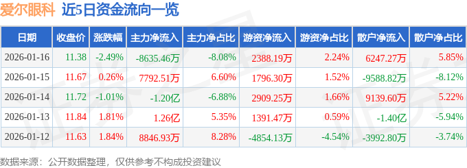 证券之星消息,截至2026年1月16日收盘,爱尔眼科(300015)报收于11.38元,下跌2.49%,换手率1.17%,成交量93.08万手,成交额10.68亿元。