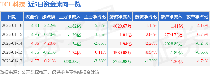 证券之星消息,截至2026年1月16日收盘,TCL科技(000100)报收于4.83元,下跌2.42%,换手率3.89%,成交量703.32万手,成交额34.19亿元。