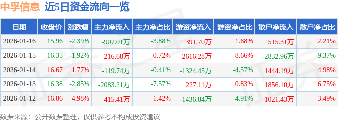 证券之星消息,截至2026年1月16日收盘,中孚信息(300659)报收于15.96元,下跌2.39%,换手率7.71%,成交量14.67万手,成交额2.33亿元。