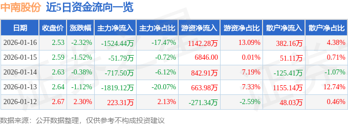 证券之星消息,截至2026年1月16日收盘,中南股份(000717)报收于2.53元,下跌2.32%,换手率1.41%,成交量34.26万手,成交额8727.5万元。