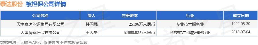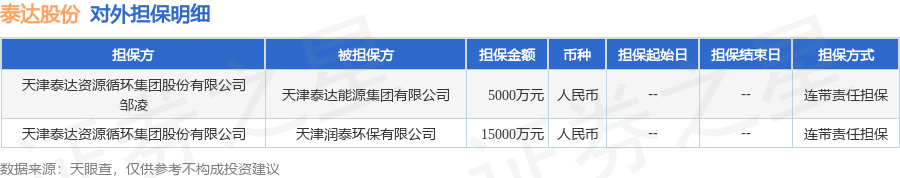 泰达股份1月15日披露2笔对外担保,被担保公司2家。对外担保明细如下表: