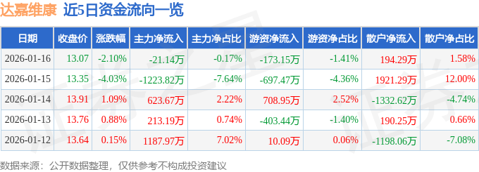 证券之星消息,截至2026年1月16日收盘,达嘉维康(301126)报收于13.07元,下跌2.1%,换手率6.79%,成交量9.37万手,成交额1.23亿元。