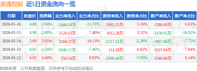 证券之星消息,截至2026年1月16日收盘,吴通控股(300292)报收于4.8元,下跌2.04%,换手率3.88%,成交量43.35万手,成交额2.09亿元。