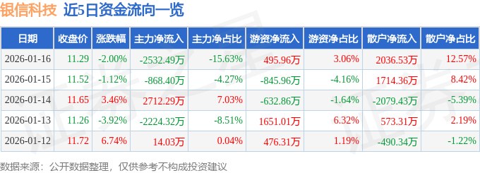 证券之星消息,截至2026年1月16日收盘,银信科技(300231)报收于11.29元,下跌2.0%,换手率3.22%,成交量14.32万手,成交额1.62亿元。