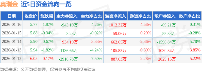 证券之星消息,截至2026年1月16日收盘,奥瑞金(002701)报收于5.77元,下跌1.87%,换手率1.49%,成交量38.17万手,成交额2.21亿元。